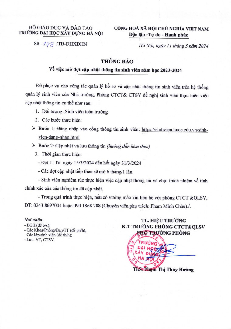 Thực hiện Thông báo số 148/TB-ĐHXDHN ngày 11 tháng 3 năm 2024 về việc mở đợt cập nhật thông tin sinh viên năm học 2023 – 2024.