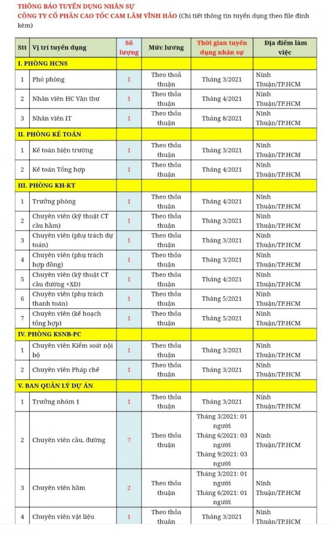Công ty TNHH Đầu tư và Phát triển Hạ tầng Vân Đồn thông báo tuyển dụng nhân sự cho Dự án đường cao tốc Tiên...