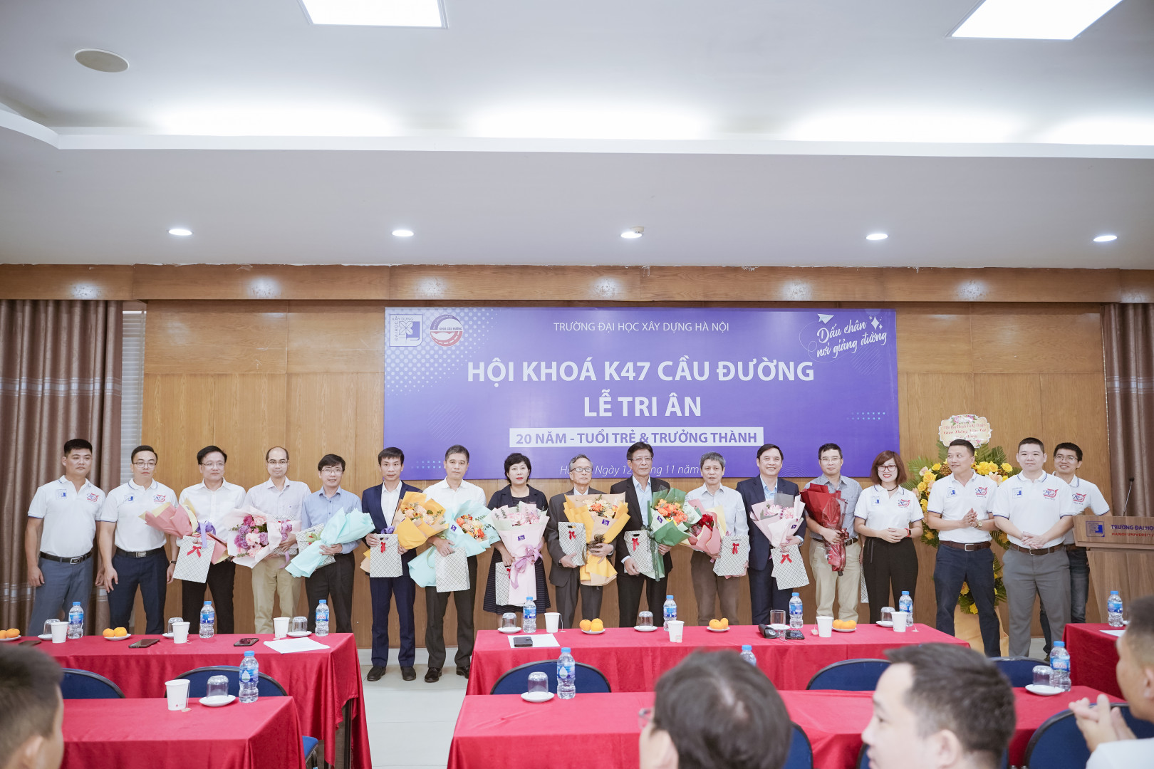 Trong không khí trang trọng của Lễ kỷ niệm, tập thể Khóa 47 Khoa Cầu Đường đã tri ân các Thầy Cô giảng viên từng phụ trách các lớp K47. Hiện nay, nhiều Thầy Cô đang giữ chức vụ quan trọng trong trường Đại học Xây dựng và Khoa Cầu Đường như: PGS.TS Phạm Duy Hòa – Hiệu trưởng trường Đại học Xây dựng Hà Nội, PGS.TS Hoàng Tùng – Phó Hiệu trưởng trường Đại học Xây dựng Hà Nội, PGS.TS Nguyễn Bình Hà – Trưởng phòng Quản lý Đào tạo, PGS.TS Nguyễn Việt Phương – Trưởng phòng Khoa học và Công nghệ. Tại buổi lễ, PGS. TS Phạm Duy Hòa đại diện cho các Thầy Cô từng giảng dạy có những lời căn dặn, động viên và chúc mừng tới các thành viên của tập thể Khóa 47 Khoa Cầu Đường. Đồng thời, đại diện tập thể khóa 47 Khoa Cầu Đường cũng đã trao quà cho quỹ khuyến học Khoa Cầu Đường để động viên và khích lệ tinh thần học tập của sinh viên trong khoa.