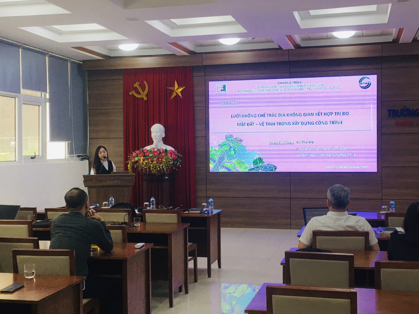 Sau đó, TS. Vũ Thái Hà đã trình bày bài nghiên cứu liên quan đến việc đảm bảo độ chính xác khi thi công nhà cao tầng và siêu cao tầng với tiêu đề “Lưới khống chế trắc địa không gian kết hợp trị đo mặt đất – vệ tinh trong xây dựng công trình”. Đây cũng là một phần nằm trong nội dung Luận án tiến sĩ của cô Hà đã bảo vệ thành công tại trường Đại học Mỏ – địa chất.