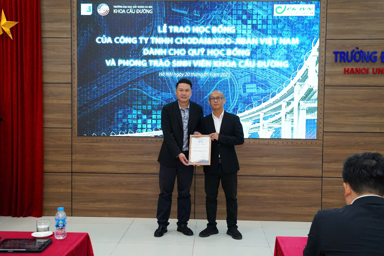 Ngày 20/05/2025, Khoa Cầu Đường – Trường Đại học Xây dựng Hà Nội đã long trọng tổ chức Lễ trao học bổng do Công ty TNHH Chodai & Kiso-Jiban Việt Nam tài trợ cho Quỹ học bổng và phong trào sinh viên của Khoa. Buổi lễ là dịp thể hiện sự gắn kết bền chặt giữa Nhà trường, Khoa và Doanh nghiệp trong công tác đào tạo và phát triển nguồn nhân lực chất lượng cao trong lĩnh vực xây dựng hạ tầng giao thông.