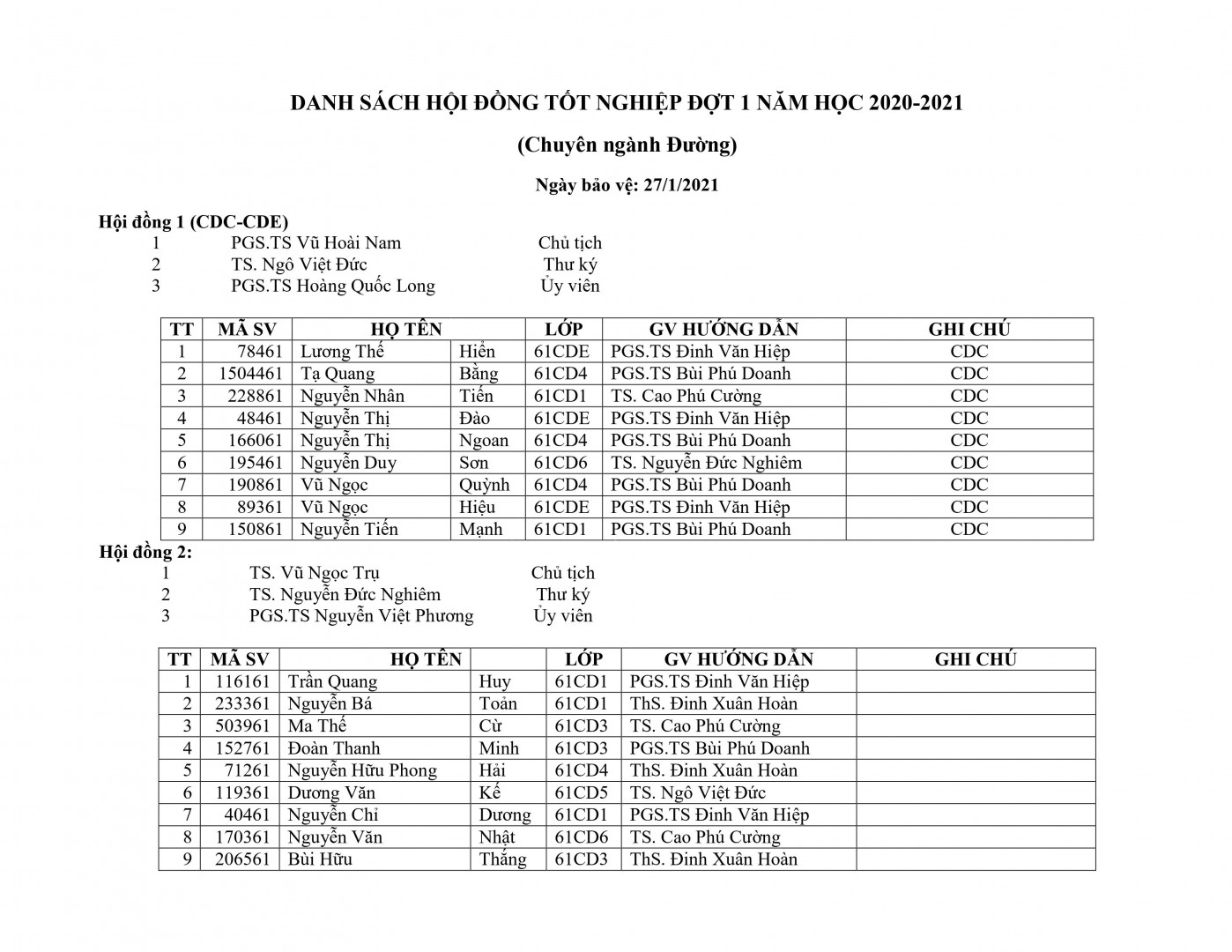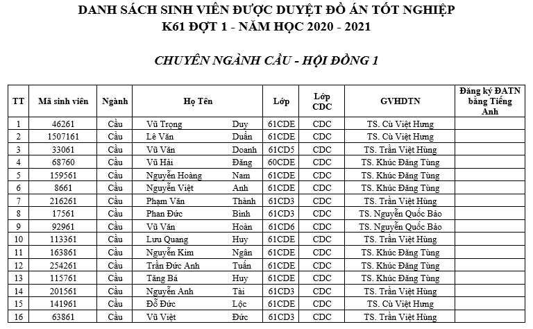 - Danh sách bảo vệ đồ án tốt nghiệp K61 đợt 1 năm học 2020-2021
