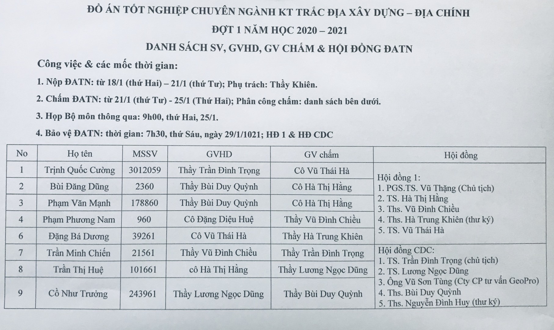 Vào thời gian từ 27-29/01/2021, Khoa Cầu Đường sẽ tổ chức các hội đồng bảo vệ đồ án tốt nghiệp đợt 1 năm học 2020-2021. Danh sách cụ thể cho từng chuyên ngành như sau: