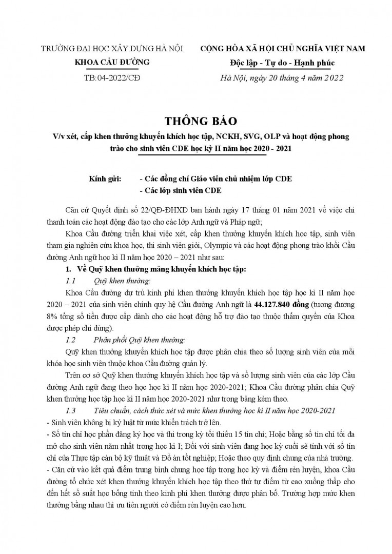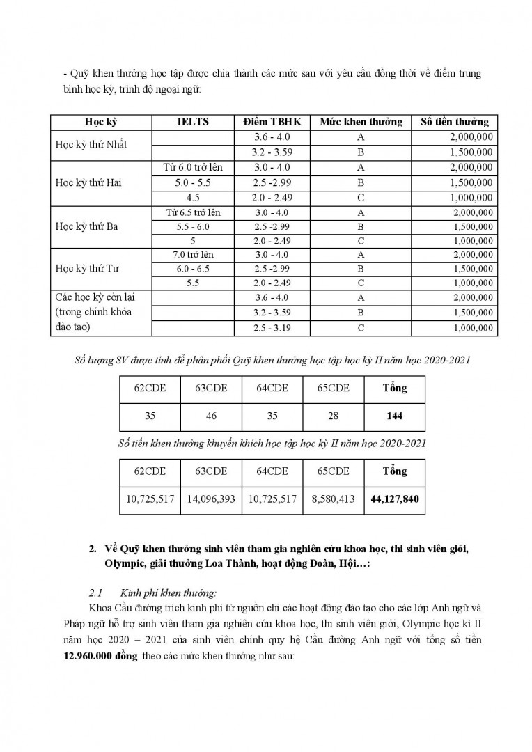 Khoa Cầu đường thông báo Danh sách khen thưởng sinh viên khối Cầu đường Anh ngữ Học kỳ 2 năm học 2020/221.