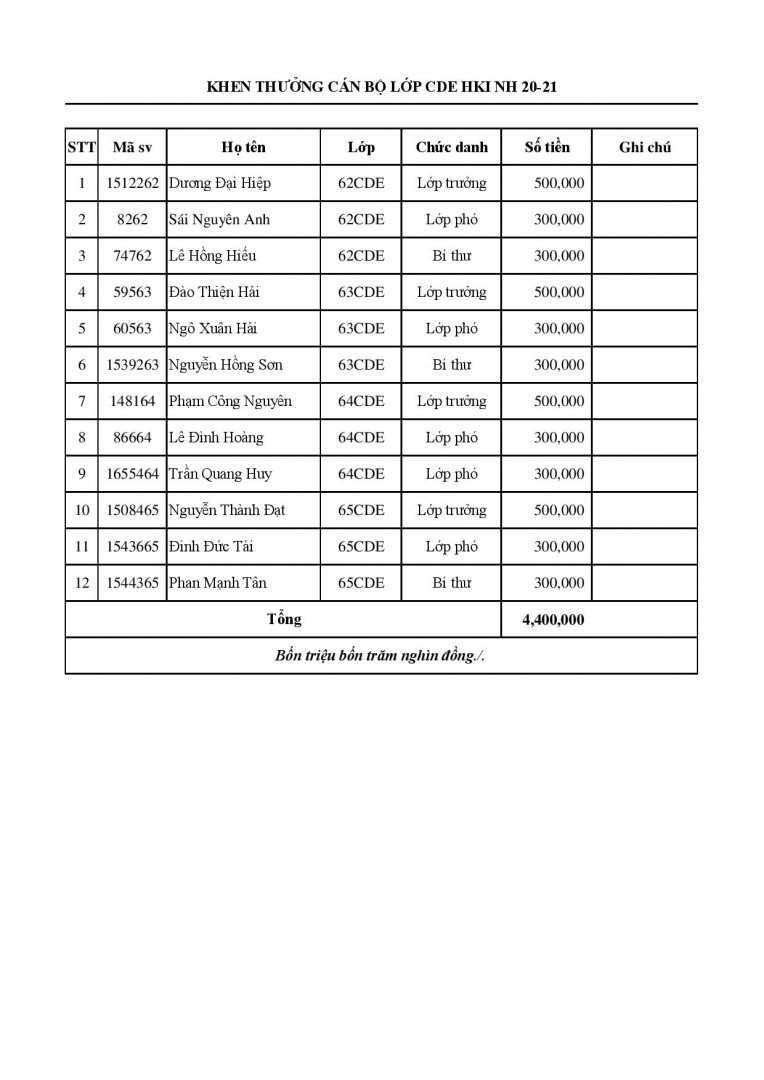 Danh sách khen thưởng khối CDE học kì 2 năm học 2020/2021