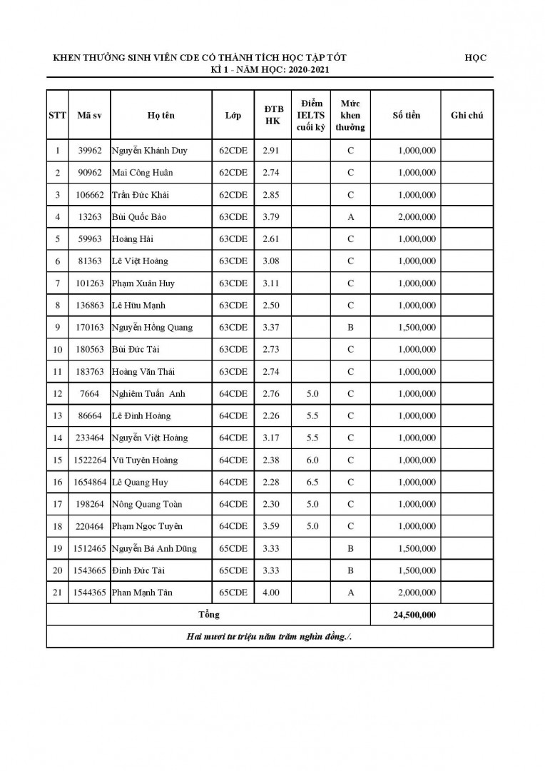 Khoa Cầu đường thông báo danh sách sinh viên CDE được khen thưởng học kì 1 Năm học 2020 – 2021: