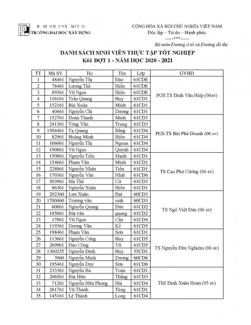 Bộ môn Đường ô tô – Đường đô thị thông báo danh sách phân công giảng viên hướng dẫn Thực tập CBKT + Đồ án Tốt nghiệp K61 đợt 1 – Học kì 1 năm học 2020 – 2021.