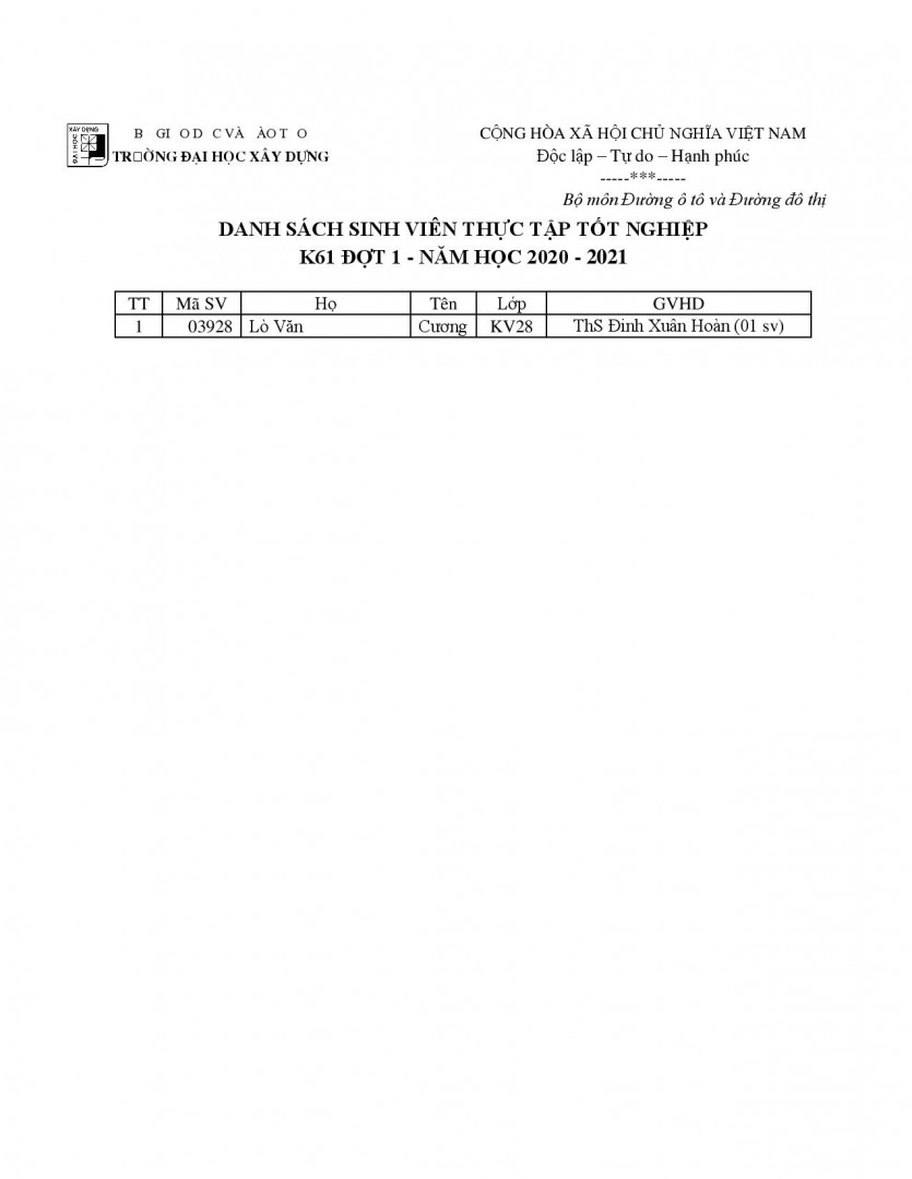 Khoa Cầu Đường thông báo danh sách sinh viên được duyệt đi Thực tập cán bộ kỹ thuật + tham quan K61 đợt 3 -...