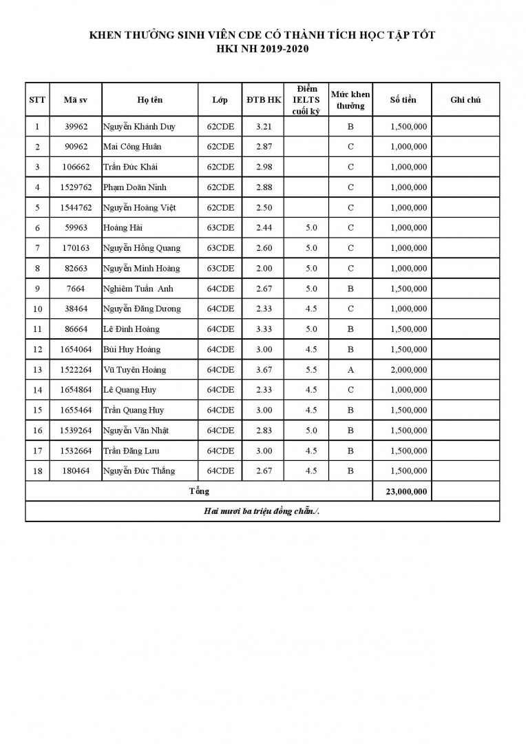 Khoa Cầu Đường thông báo danh sách sinh viên hệ Cầu đường Anh ngữ đạt tiêu chí khen thưởng năm học 2019/2020 của hệ CDE như sau: