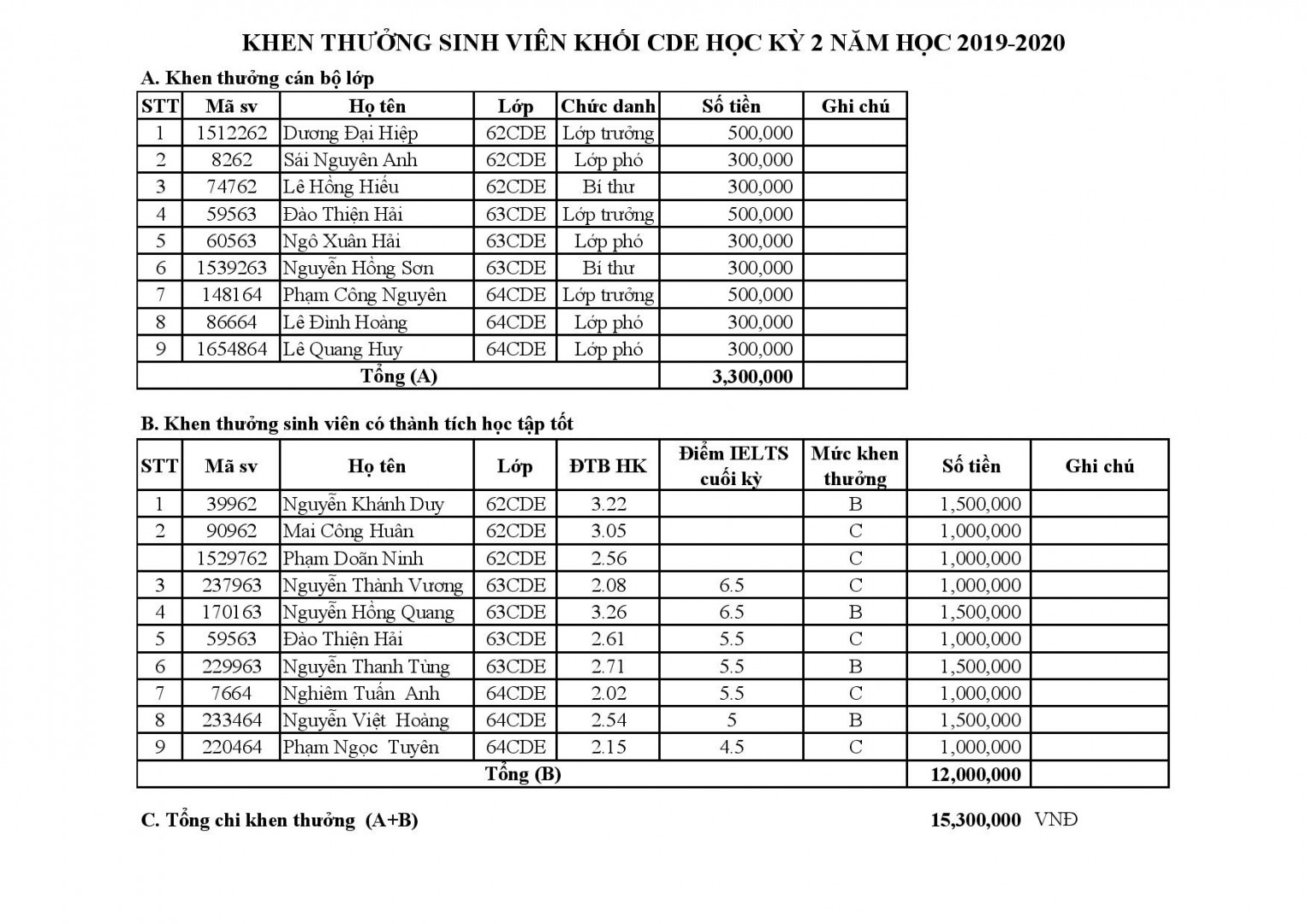 Thông báo các tiêu chí khen thưởng lớp CDE