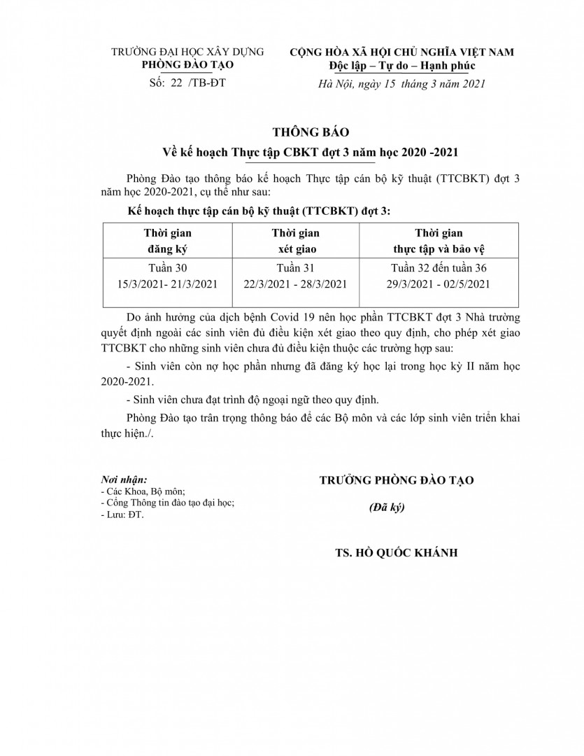 Thông báo Danh sách sinh viên giao Thực tập cán bộ kỹ thuật Đợt 2 NH 2021/2022