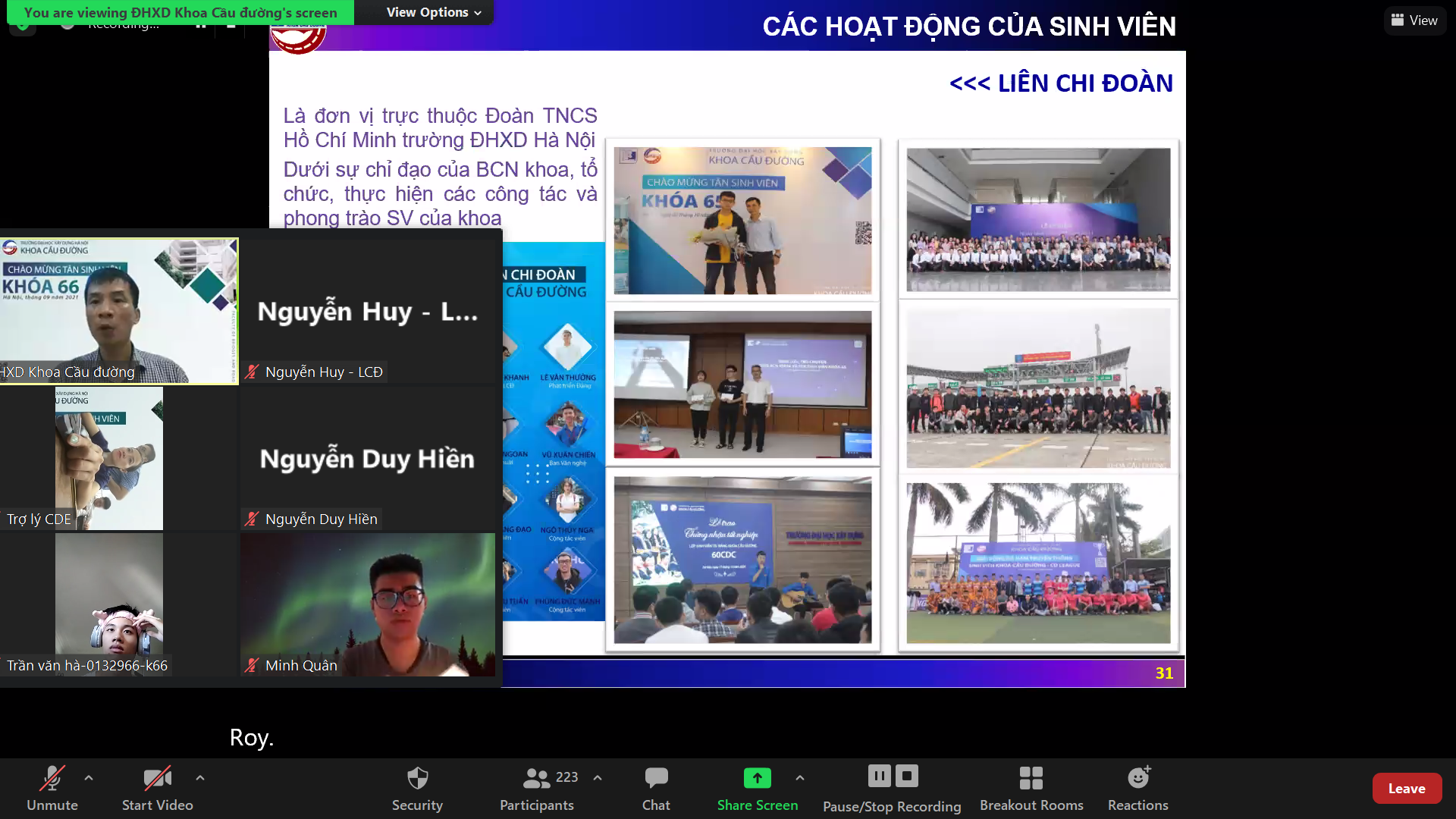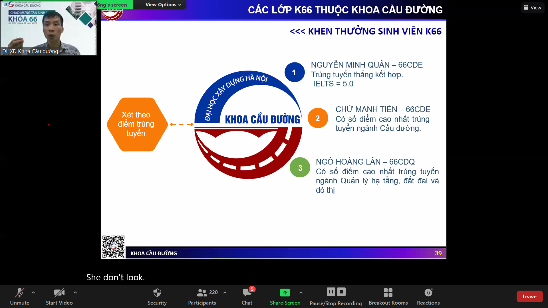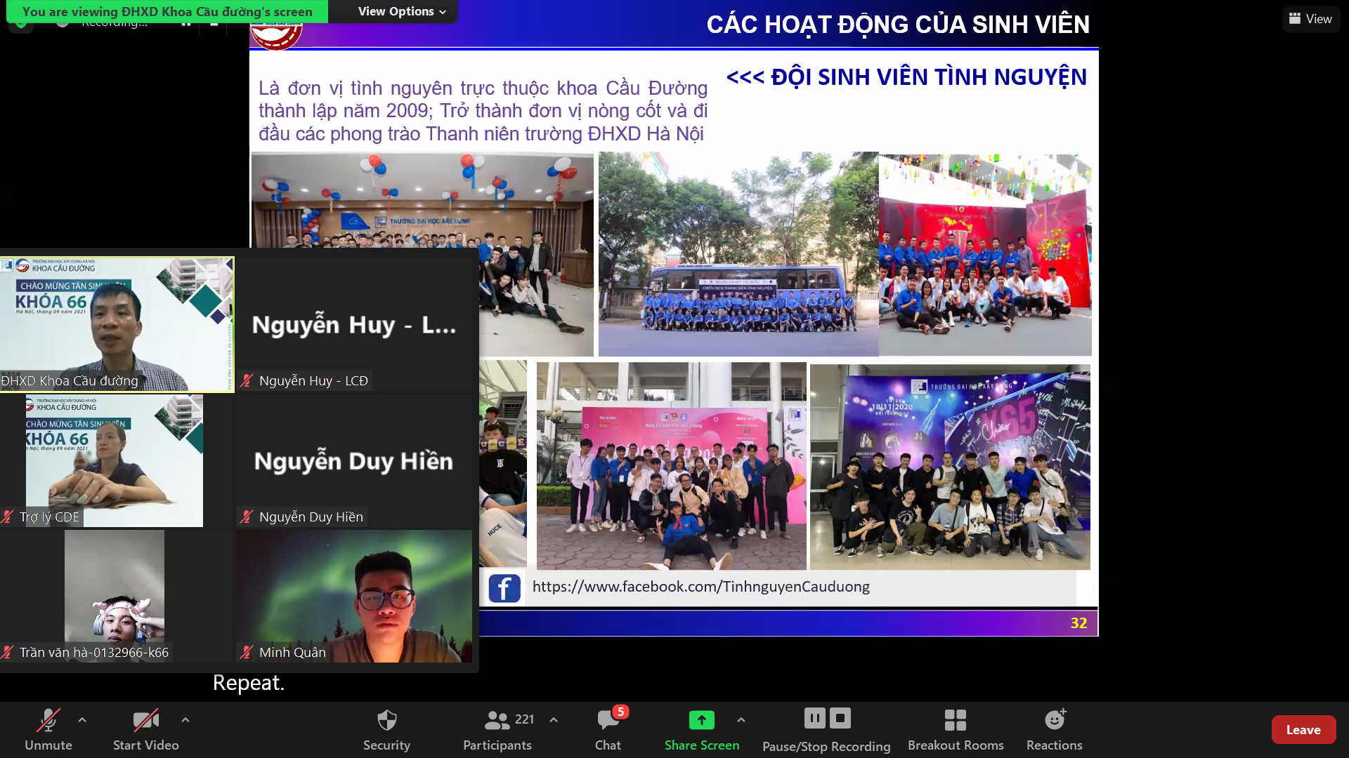 Chiều ngày 28 tháng 09 năm 2021, khoa Cầu Đường đã tổ chức buổi gặp mặt giữa các thầy Ban Chủ Nhiệm Khoa, thầy/cô giáo viên chủ nhiệm với các tân sinh viên K66. Tại buổi gặp mặt này, các bạn sinh viên K66 đã được các thầy trong BCN Khoa giới thiệu tổng thể thông tin về khoa Cầu Đường, các chương trình đào tạo và các hoạt động sinh viên của Khoa. Sau đó, các bạn sinh viên K66 đã gặp gỡ và trao đổi các câu hỏi với các thầy/cô giáo viên chủ nhiệm.