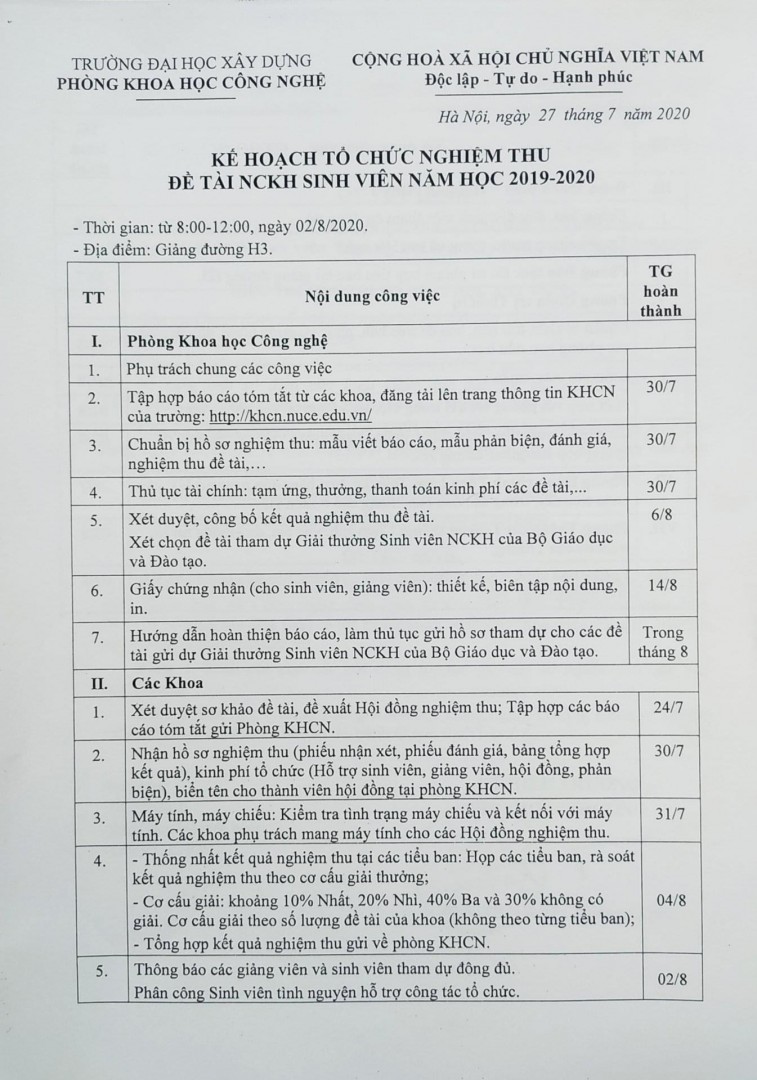 - Kế hoạch tổ chức nghiệm thu đề tài NCKHSV năm học 2019-2020