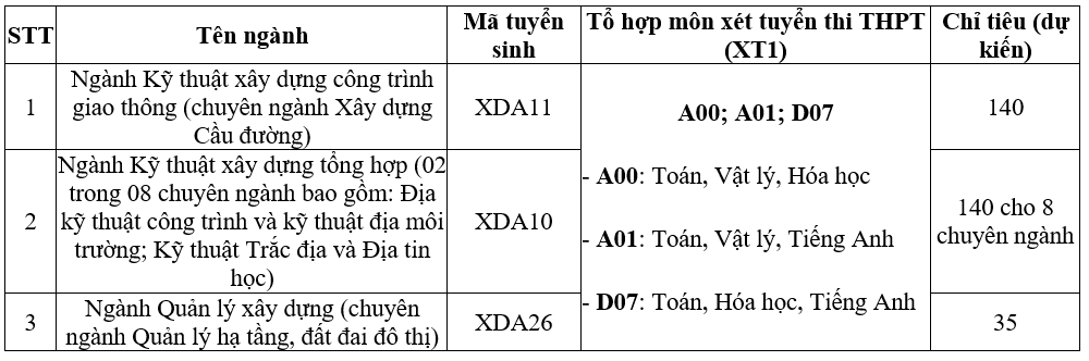 | 1 | Ngành Kỹ thuật xây dựng công trình giao thông (chuyên ngành Xây dựng Cầu đường) | 16.00 | 16.00 | 16.00 | 17.25 |
