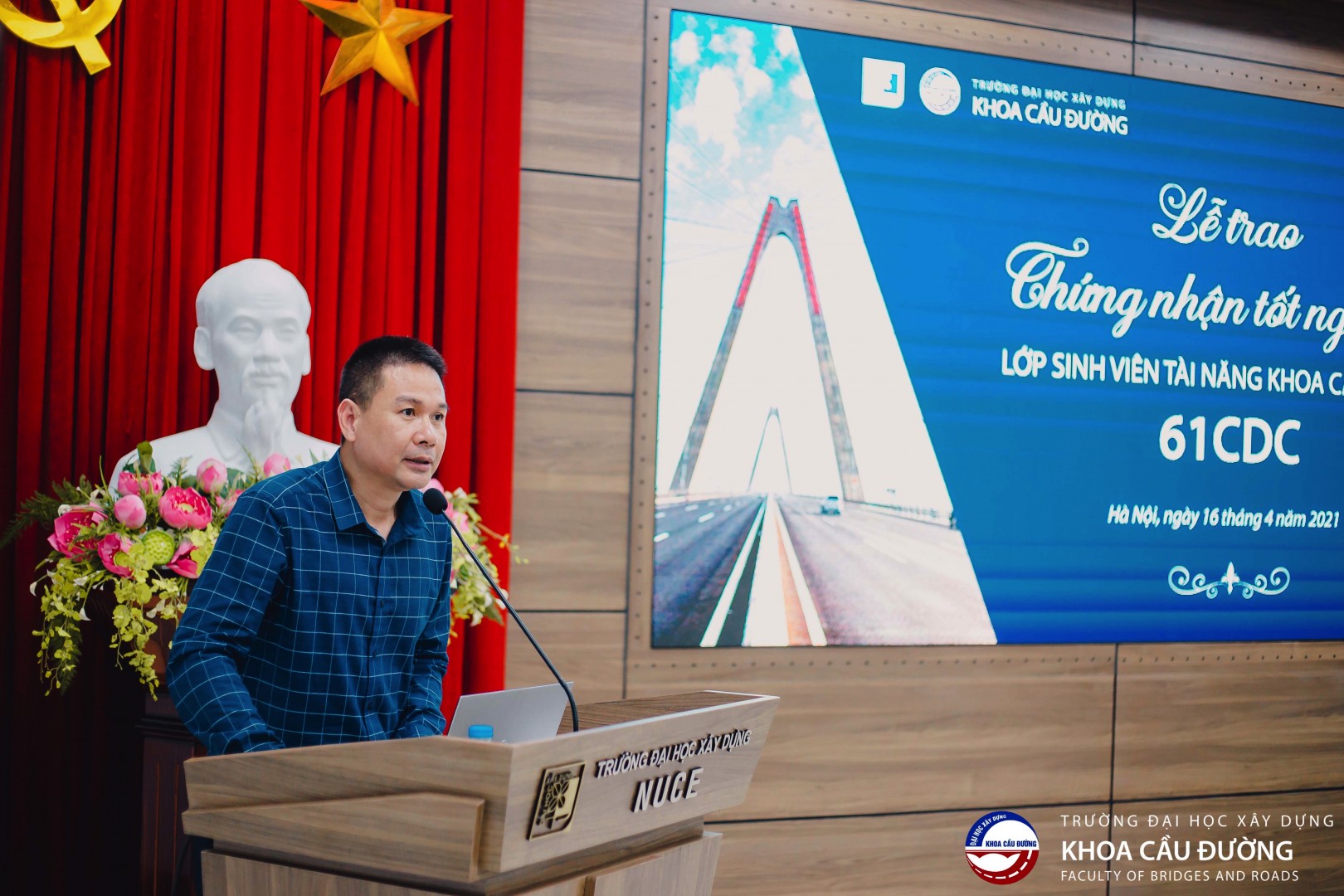 Đến dự buổi lễ có sự có mặt của các thầy trong Ban Chủ Nhiệm Khoa, các thầy cô giáo trong Khoa, cùng các sinh viên lớp 61CDC và CDC các khóa. Phát biểu tại buổi lễ, TS Cù Việt Hưng phó khoa Cầu Đường đã gửi lời chúc mừng tới 39 sinh viên lớp 61CDC được nhận chứng nhận tốt nghiệp chương trình đào tạo Kỹ sư Cầu đường tài năng. Tiếp đến sinh viên Nguyễn Thị Ngoan thay mặt cho các bạn sinh viên lớp 61CDC bày tỏ sự biết ơn tới các thầy cô trong khoa và kính tặng các thầy cô bó hoa tươi thắm và quà kỷ niệm.