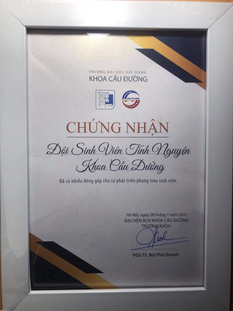 Ngày 10 tháng 4 năm 2021, chương trình kỉ niệm 12 năm ngày thành lập đội SVTN Khoa Cầu Đường đã kết thúc tốt đẹp. Buổi lễ diễn ra vô cùng ấm cúng và thân mật với sự góp mặt các thầy trong BCN khoa, LCĐ khoa, các vị khách mời, các đội trưởng các đội tình nguyện trong trường Đại học Xây dựng và đại gia đình Đội. Trong buổi lễ này, BCN khoa Cầu Đường đã trao tặng giấy chứng nhận cho Đội SVTN vì đã có nhiều đóng ghóp cho sự phát triển của phong trào sinh viên khoa để ghi nhận sự cố gắng và đóng góp của Đội.