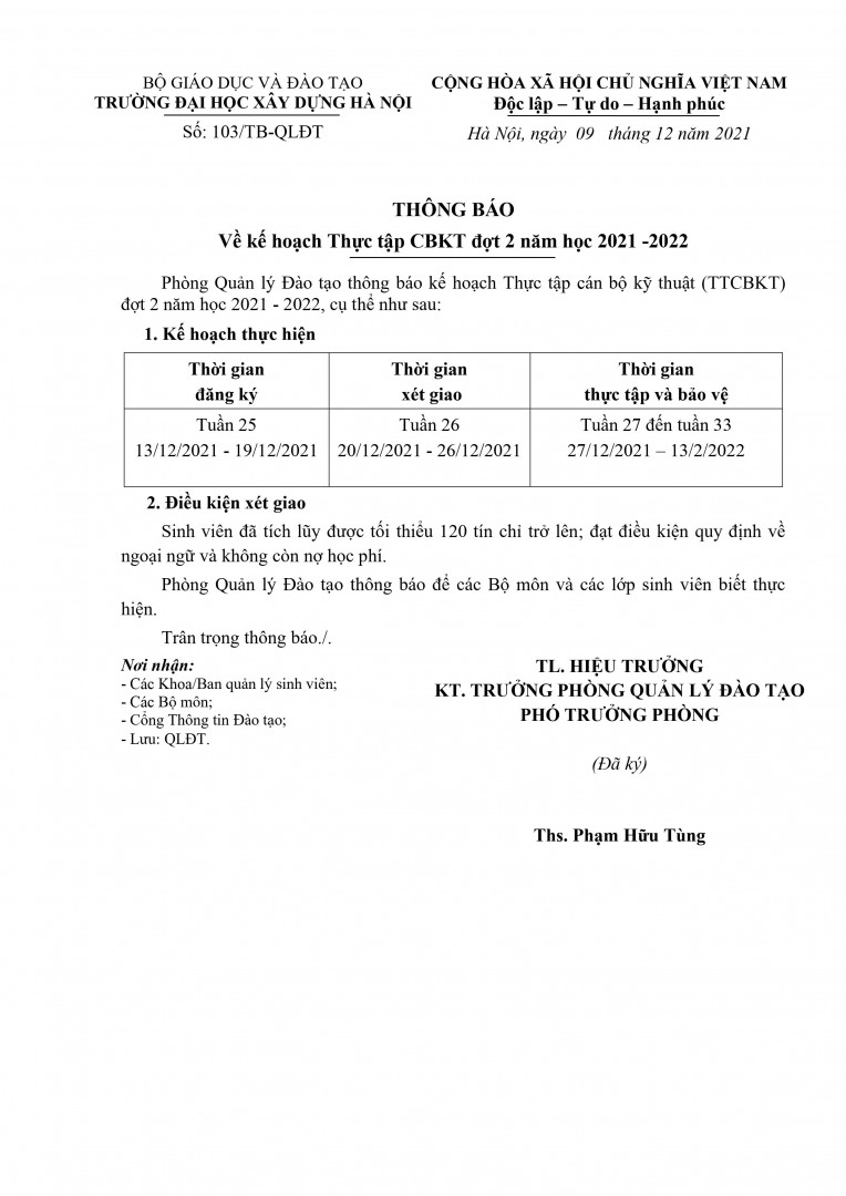 Thông báo Danh sách sinh viên giao Thực tập cán bộ kỹ thuật Đợt 2 NH 2021/2022