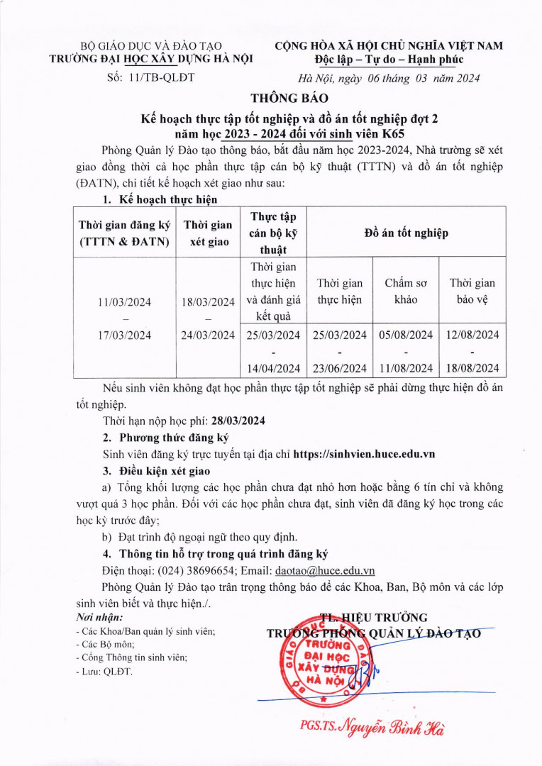 - Kế hoạch xét giao Thực tập Tốt nghiệp + Đồ án tốt nghiệp – Tháng 3*2024: Theo Thông báo số 11/TB-QLĐT ngày 06 tháng 3 năm 2024.