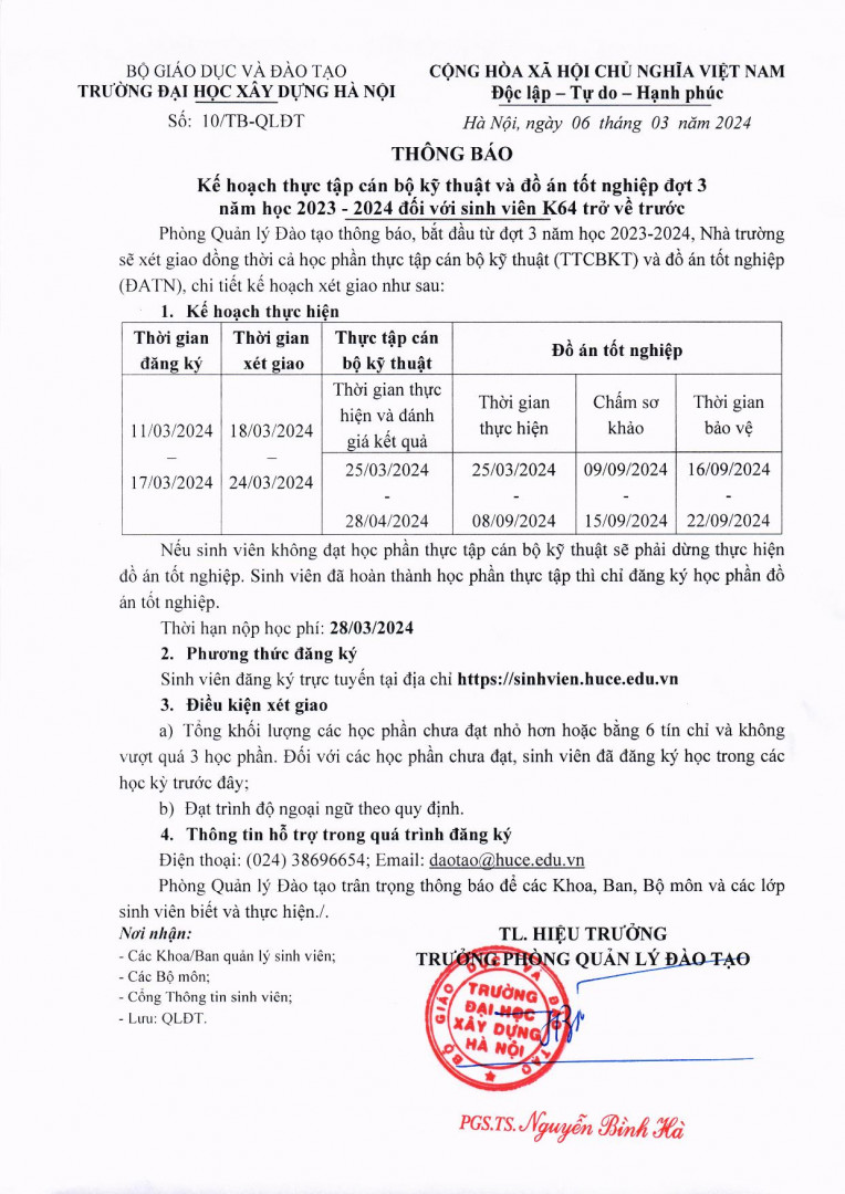 - Kế hoạch xét giao Thực tập Tốt nghiệp + Đồ án tốt nghiệp – Tháng 3*2024: Theo Thông báo số 10/TB-QLĐT ngày 06 tháng 3 năm 2024.
