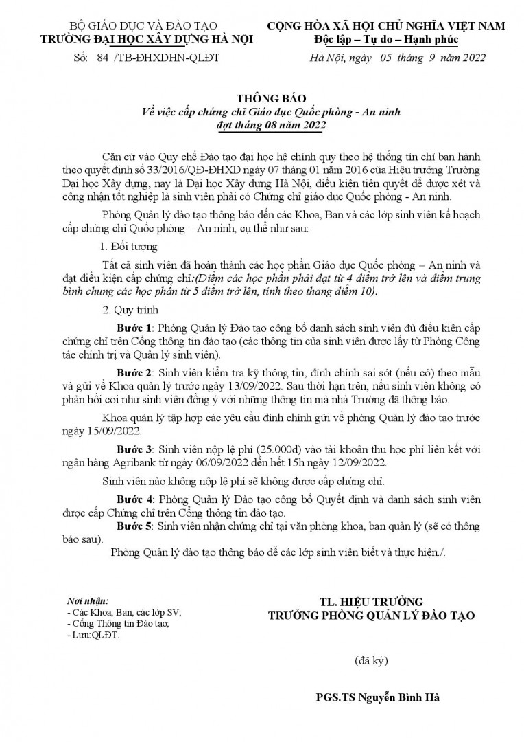 Khoa Cầu đường thông báo đến sinh viên kế hoạch cấp chứng chỉ Quốc phòng An ninh Tháng 8*2022. Chi tiết sinh viên xem theo thông báo số 84 /TB-ĐHXDHN-QLĐT ngày 05 tháng 9 năm 2022.