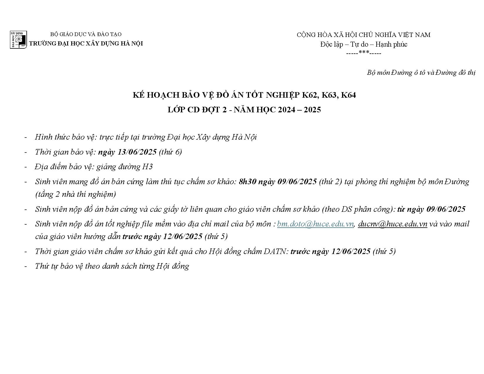 Khoa Cầu đường thông báo kế hoạch Bảo vệ Đồ án tốt nghiệp đợt 2 năm học 2024-2025 đối với chương trình kỹ sư, kiến trúc sư.
