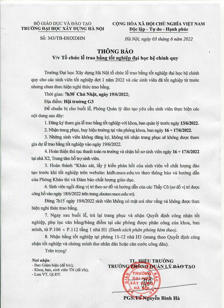 - Sinh viên thực hiện các bước như thông báo số 343/TB-ĐHXDHN ngày 03 tháng 6 năm 2022 về việc tổ chức lễ trao bằng tốt nghiệp đại học hệ chính quy.