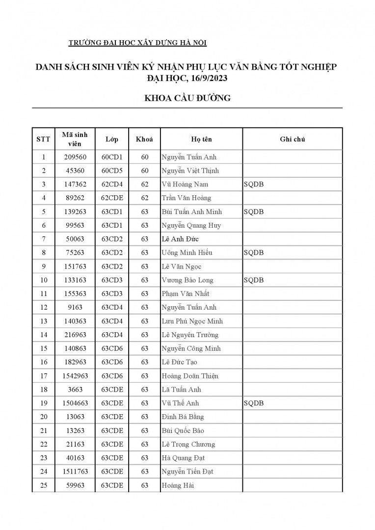 Trường Đại học Xây dựng Hà Nội tổ chức lễ trao bằng tốt nghiệp đại học hệ chính quy cho các sinh viên tốt nghiệp đợt 2 năm 2023, cụ thể như sau: