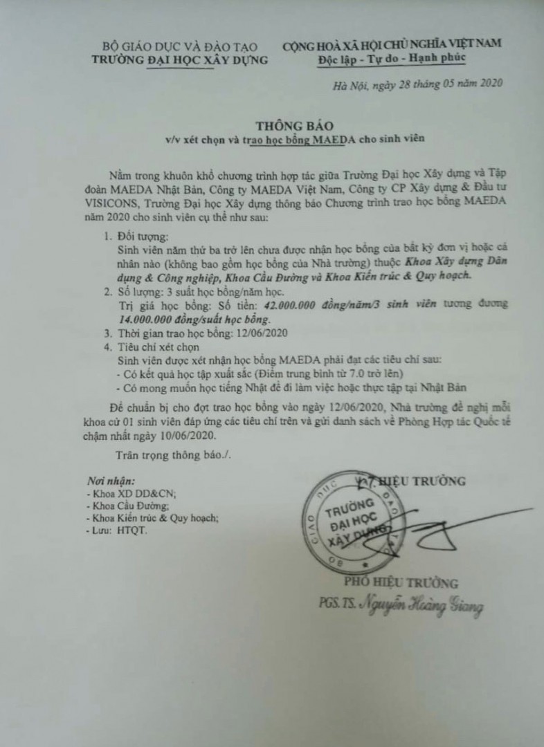 Thông báo về việc xét chọn học bổng MAEDA Nhật Bản trong khuôn khổ chương trình hợp tác giữa Đại học Xây dựng và Tập đoàn MAEDA Nhật Bản, Công ty MAEDA Việt Nam, Công ty CP Xây dựng & Đầu tư VÍICONS.