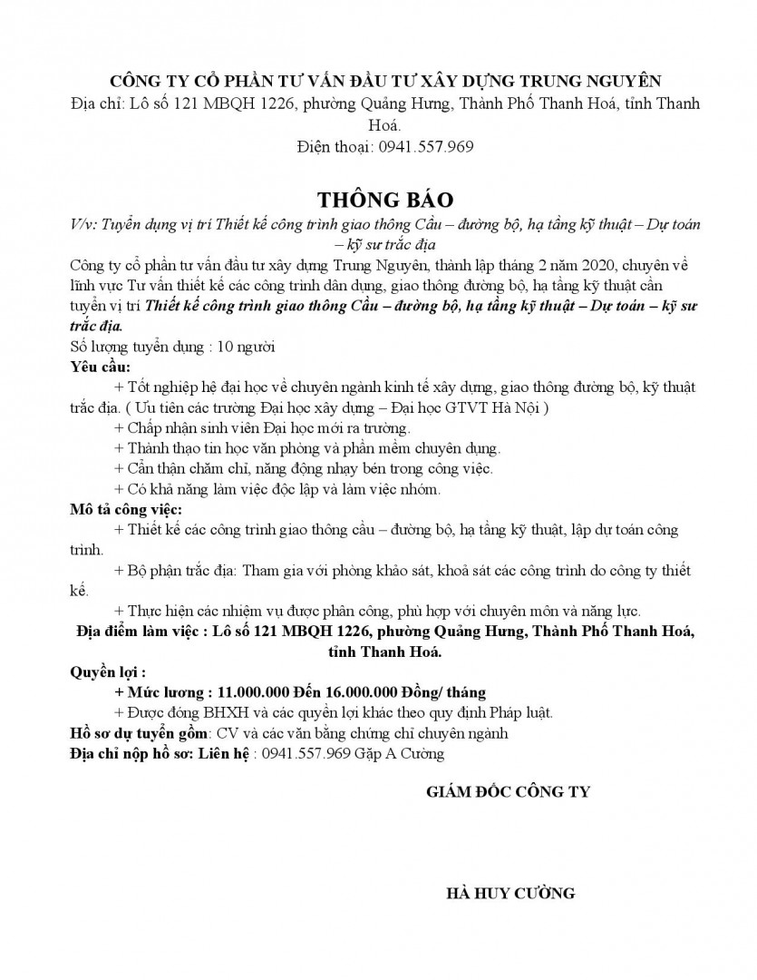 THÔNG BÁO TUYỂN DỤNG Công ty Cổ phần Tư vấn đầu tư Xây dựng giao thông tỉnh Bà Rịa Vũng Tàu. Địa chỉ: 01-G2- Đường...