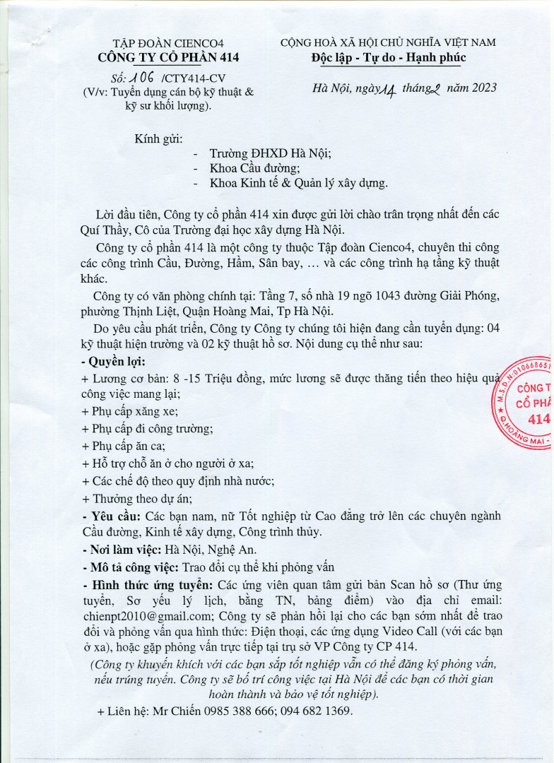 [Tuyển dụng] Công ty Cổ phần 414 – Tập đoàn CIENCO4
