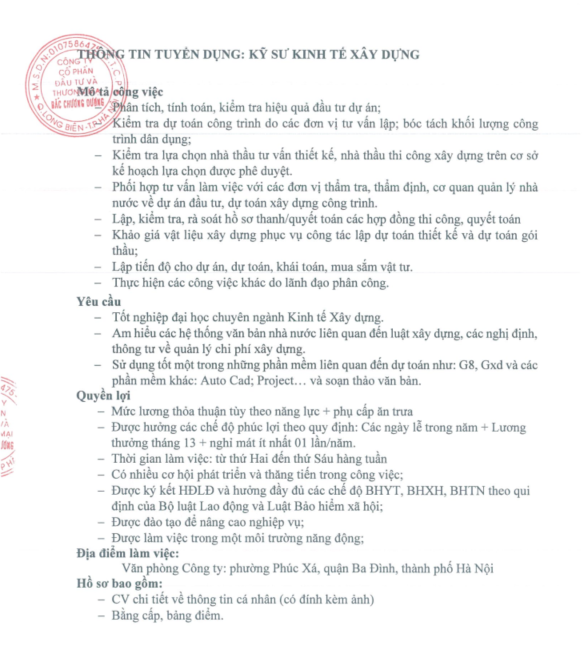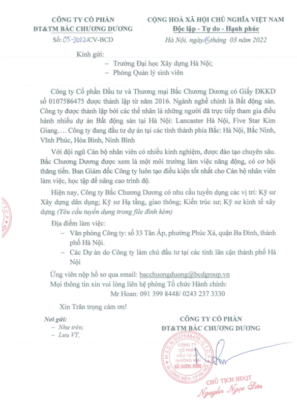 [Tuyển Dụng] CÔNG TY CỔ PHẦN ĐT&TM BẮC CHƯƠNG DƯƠNG
