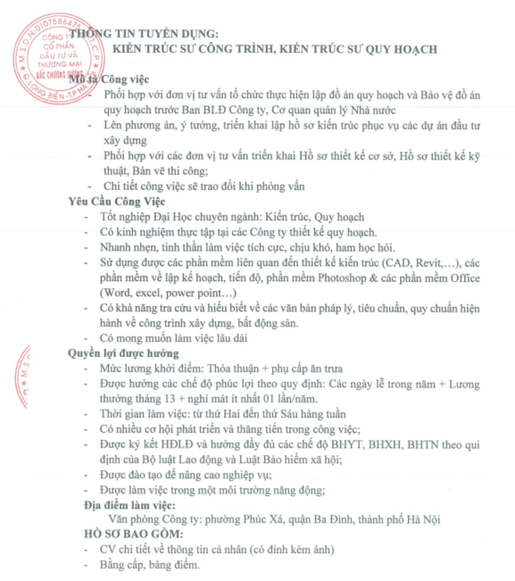 [Tuyển dụng] Công ty CPĐT và xây dựng Phương Thành
